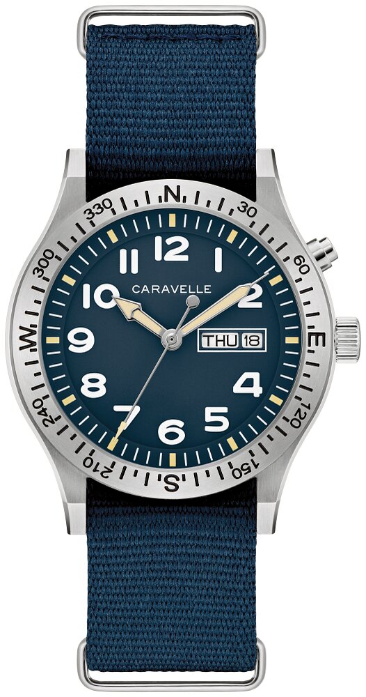 Inspired by vintage American field watches, the men’s Caravelle Field watch is a purpose-built timepiece meant for adventure. Made from 316L stainless steel, the case features a compass bezel and angled lugs. Bold numerals and a day and date display offer utility and exceptional legibility against the matte blue dial, which lights up with the push of a button. Paired with a durable blue nylon pass-through strap for added comfort and security, the men’s Caravelle Field watch won’t break a sweat, even when you do.