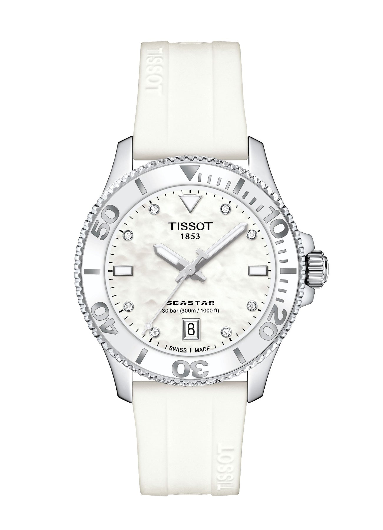 Tissot T-Sport Seastar 1000, water-resistant up to a pressure of 30 bar (300 m / 1000 ft), 36mm, scratch-resistant sapphire crystal with double-sided antireflective coating, screw-down crown and caseback, Swiss quartz, mother of pearl dial with diamond indexes, stainless.
